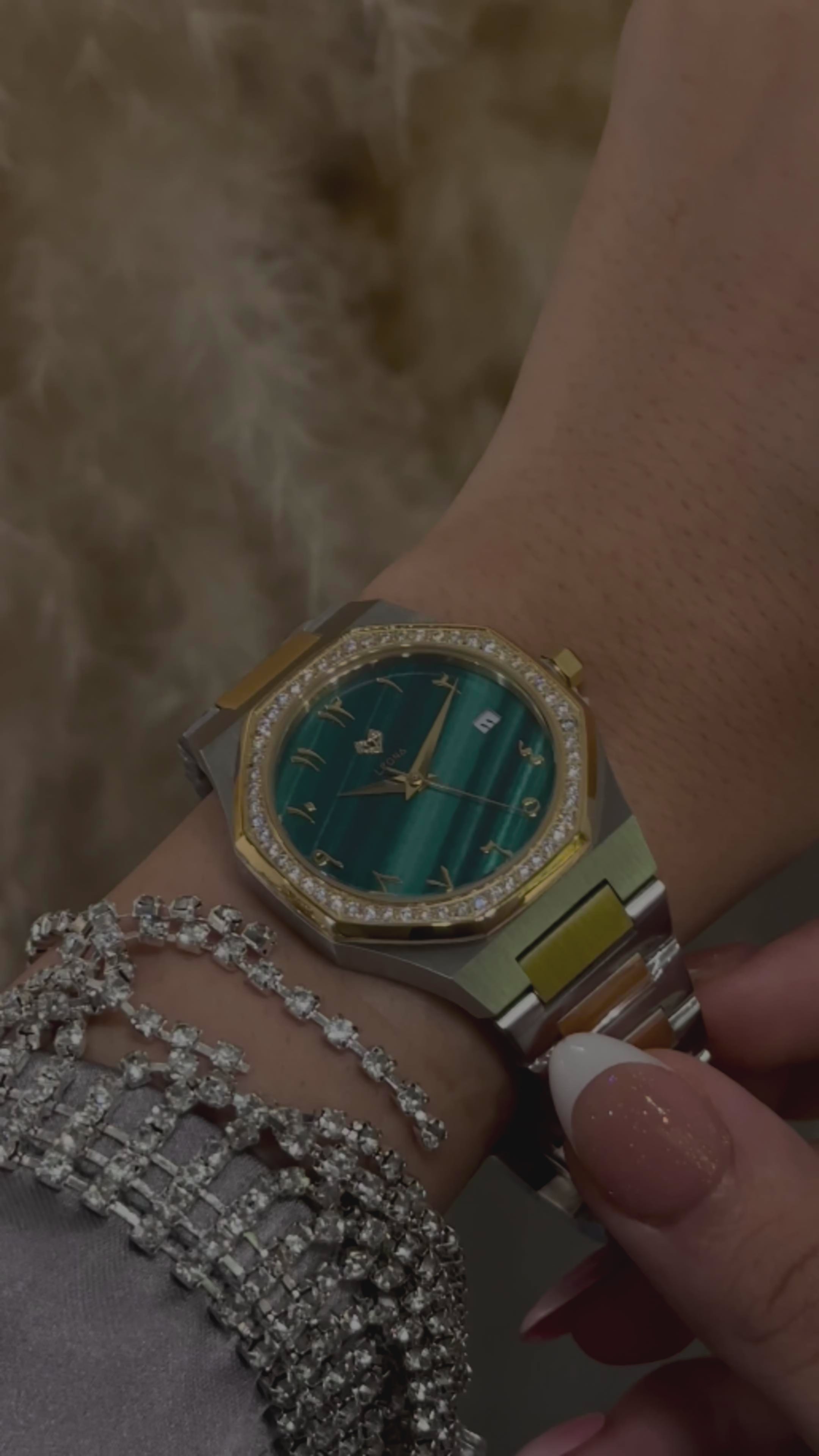 أناقة كلاسيكية بلمسة عصرية. تجمع ساعة ماركيز بين الفولاذ المقاوم للصدأ 316L المطلي بالذهب الخالص وميناء أخضر داكن وأرقام عربية ونافذة أنيقة لعرض التاريخ باللغة العربية، مما يمنحها مظهراً مميزاً وراقياً.
