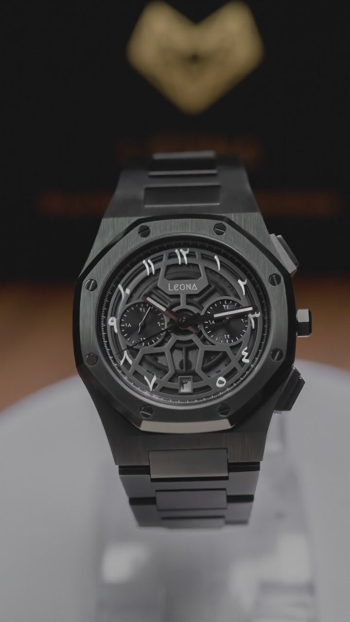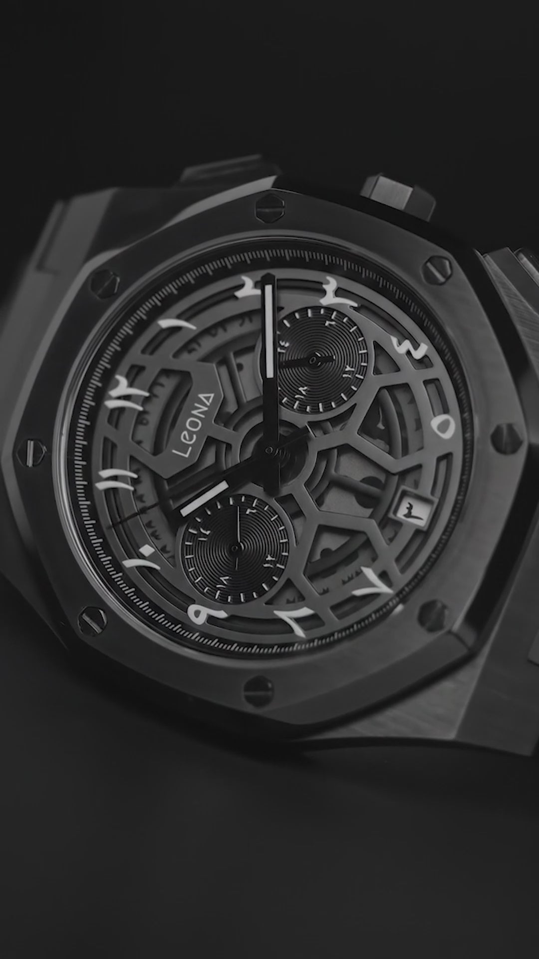 مصنوعة من فولاذ فاخر 316L بلون جانميتال، تعكس في كل تفصيلة مزيجًا من القوة والرقي. المينا الهيكلية المكونة من ثلاث طبقات بأرقام عربية وعدادات فرعية سوداء تكشف عن فن صناعة الساعات في تصميم معماري متدرّج، يلتقط الضوء ويبرز جمالها الفريد في كل زاوية.