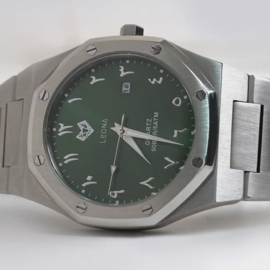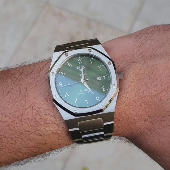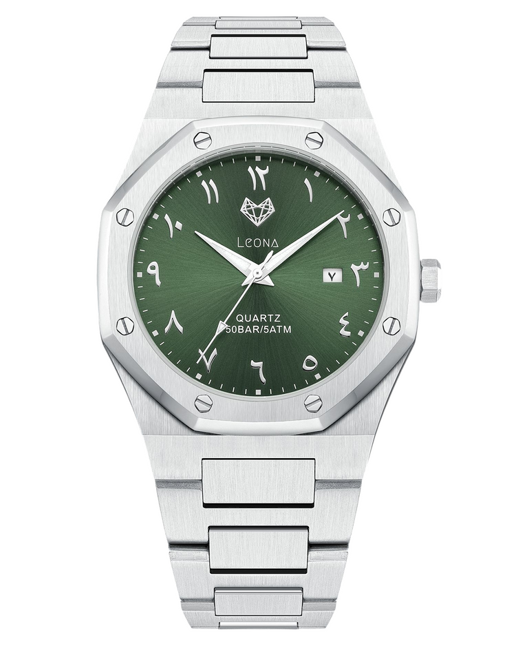 The Royal Green watch blends timeless elegance with modern boldness. Featuring a deep green sunburst dial that shifts beautifully with light, and refined Arabic numerals that add heritage and clarity, this timepiece commands attention without being loud.